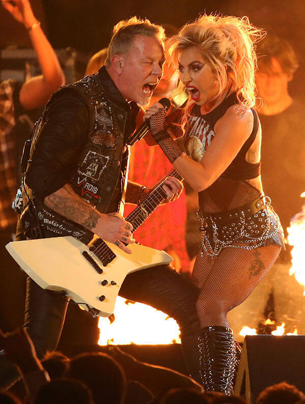 メタリカのヴォーカリスト、ジェイムズ・ヘットフィールドが、炎の上がるステージで「Moth Into Flame」をパワフルに歌い始めた……はずが、声が全く聞こえてこない。片やガガはパワフルな歌声を披露している。どうやらヘッドフィールドのマイクだけに音声トラブルが発生してしまったようなのだ。