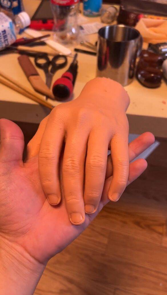 ――今年6月に「高精度な左手の複製を安定して行えるようになりました!!」とポストされていましたが、どこら辺に満足したから「高精度な左手の複製が行えるようになった」と満足できたのでしょうか?ピエロ大好き人間:以前は、型を二分割して手を複製していたんです。まずは、“手の甲側の型”と“手のひら側の型”を作り、その二つをくっつけて完成させていました。ただ、その方法だとどうしても型の境目のところにバリ(加工する際に発生する突起)ができてしまい、その問題点はずっと気になっていました。でも、最近はすべて一つの型で複製する方法にたどり着き、高精度な左手の複製が安定して行えるようになったんです。