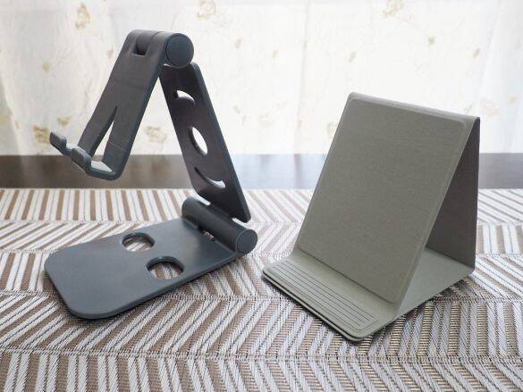 対するダイソーは、持ち運べないことはないけれど、開閉時にわりと大きめの音が出るので自宅で使いたいですね。角度調整に優れているので、じっくり長時間スマホと向き合う時に活躍してくれています。