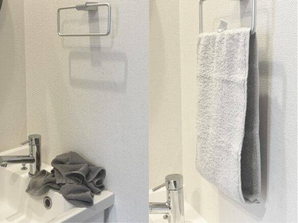 フェイスタオルをタオルバーに掛けるときは、タオルを二つ折りにして長さを揃えると思いますが、何度も手を拭いているとタオルのバランスが崩れ、最終的にタオルが落下しているなんてことは日常茶飯事。特に子どもたちがタオルを使用した後はこういった光景を目にすることが多く、「タオル落とさないで!」「タオルを落としたら掛けといて!」と口にすることもしばしば……。