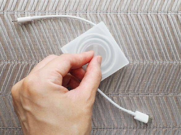 商品は、手のひらにすっぽりと収まるコンパクトサイズ。重量は約20g(独自に計測)と軽量で、素材にはプラスチックの一種・ポリプロピレンが使われていて、硬くて丈夫な印象です。表側には、ケーブルを巻き取る時に使うつまみ。