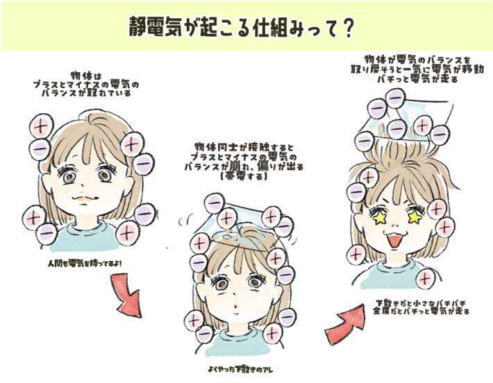 私たち人体を含めた全ての物体には、プラスとマイナスの電気を持っています。それぞれの物体はプラスとマイナスの電気バランスが取れているのですが、物体同士が接触すると電気が移動し、バランスに偏りが生まれます。このバランスが崩れた状態を「静電気」と呼びます。静電気状態になると、物体同士は偏った電気のバランスを取り戻そうと一気に電気を放流し、バチっと痛い感覚を覚えるのです。下敷きで頭をこする場合はパチパチと小さな電気が放流された結果、髪の毛が立ち上がる現象になります。