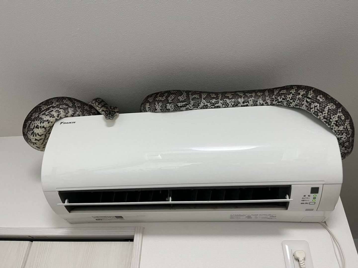 いるるさんによると、エアコンと天井の隙間に入っているのは、いるるさんの飼育しているヘビ。コースタルカーペットパイソンの「フェノ」だ。