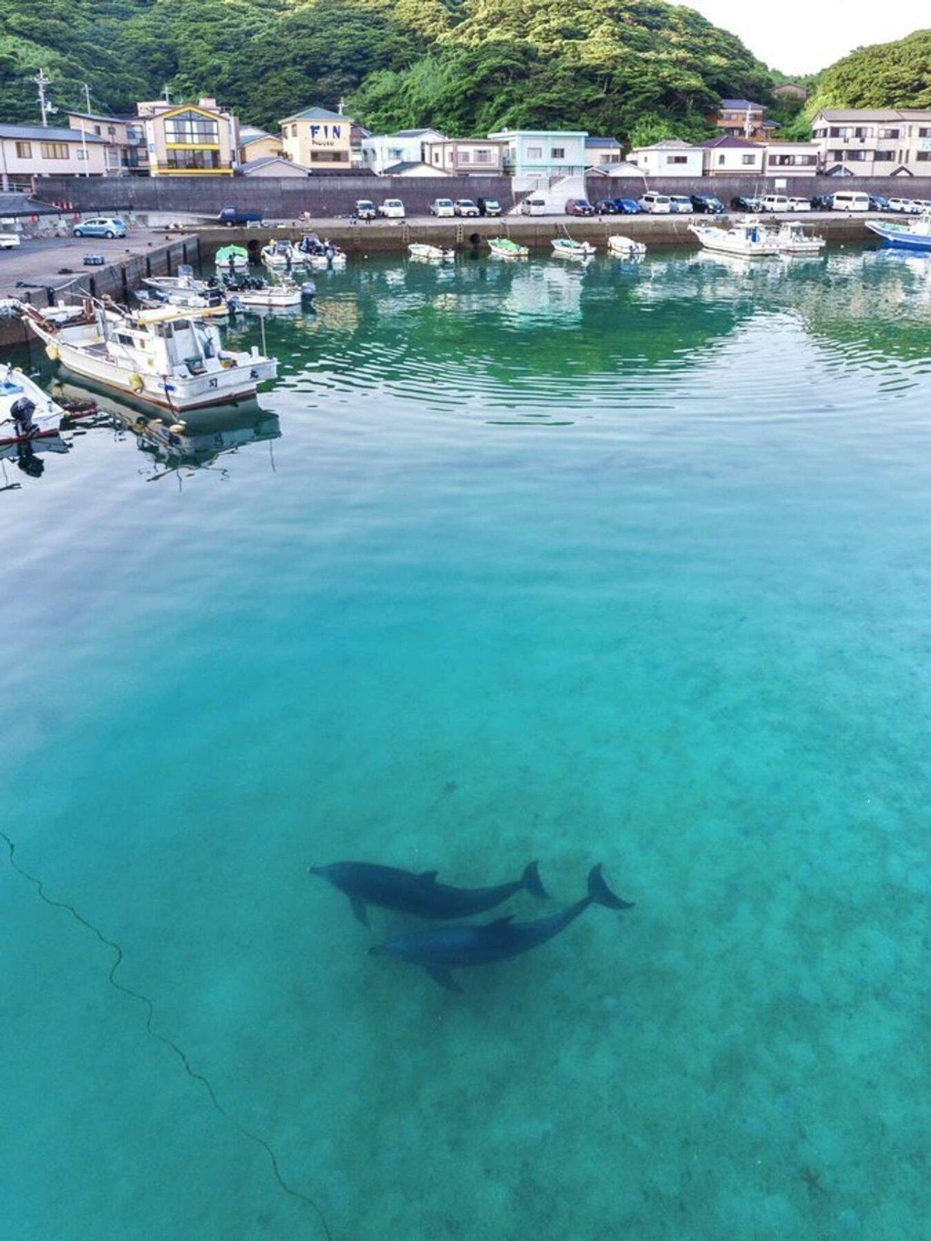透明度の高さも素晴らしいが、注目すべきはそのなかを泳ぐ、二頭のイルカ!