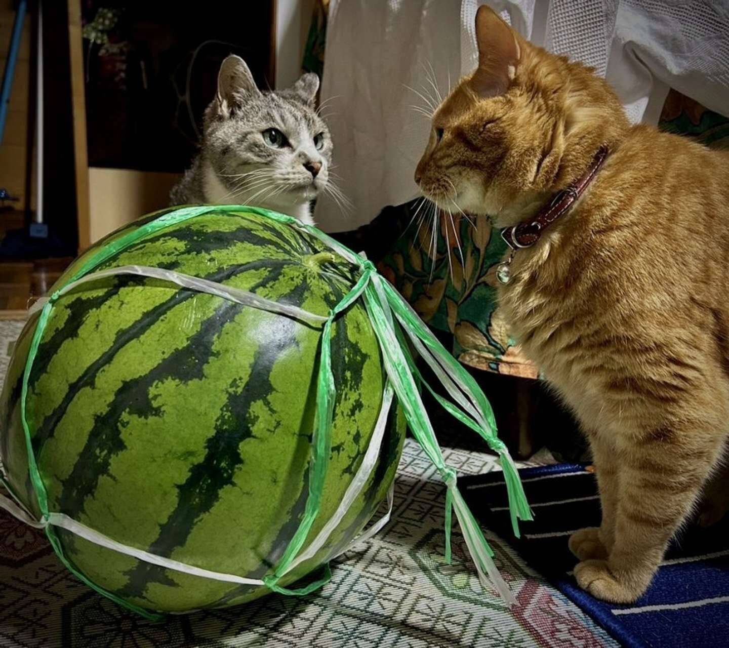2025年8月19日、Xユーザーのサユヤス(@SHAKEhizi_BSK)さんが投稿したのは、大きなスイカを前に相対する2匹の猫の写真。