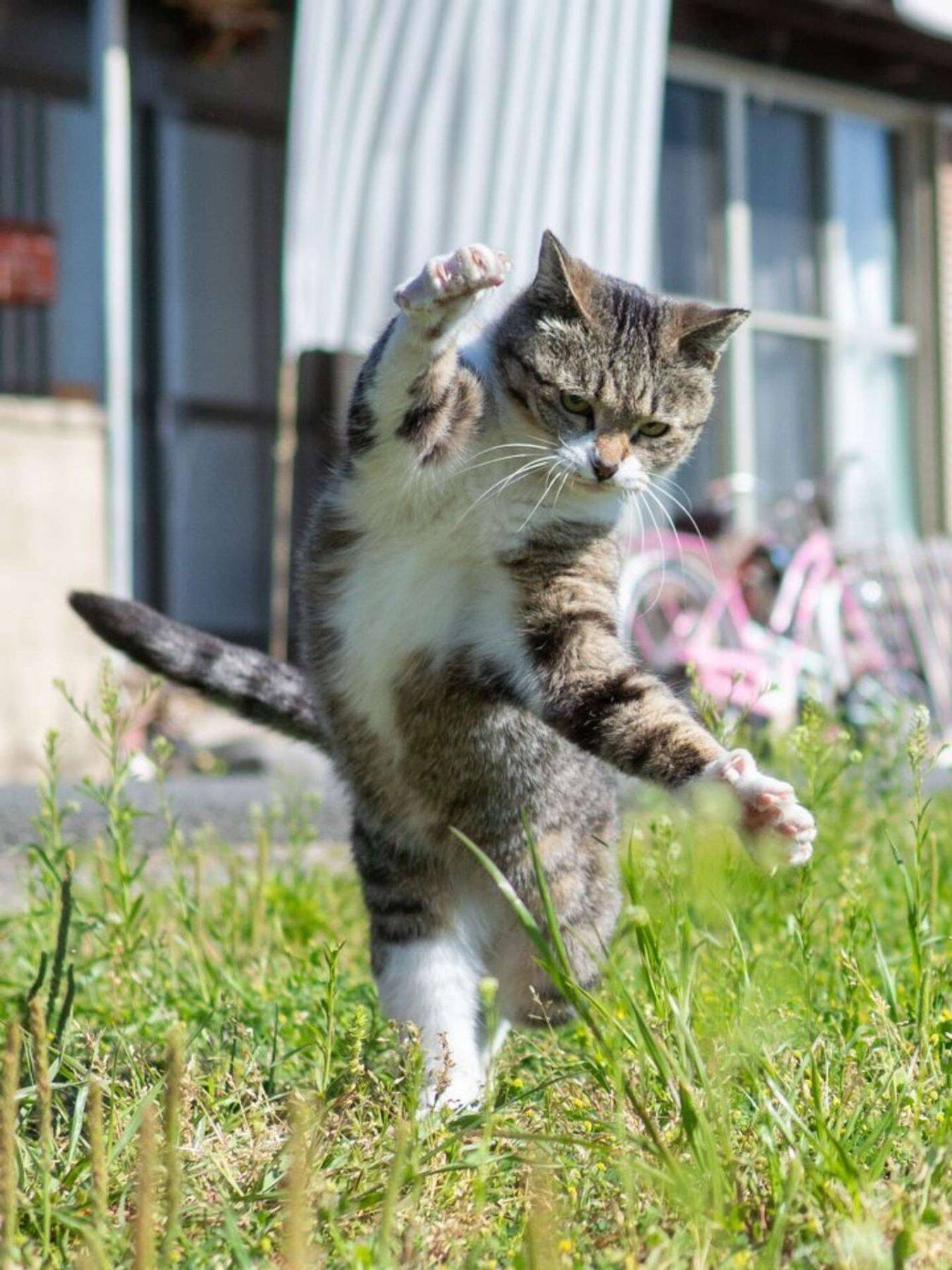 2025年8月29日、九州在住のフォトグラファー・久方広之(@sakata_77)さんがそんな〝セリフ風〟のつぶやきと共に投稿したのは、前足を大きく広げたポーズを取る猫の写真だ。