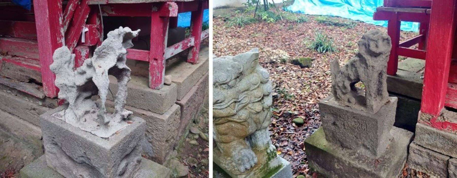 18日、記者の取材に応じた国東市教育委員会・文化財課職員によると、この狛犬たちは、櫛来社境内本殿に向かって左横に位置する若宮八幡社のもの。