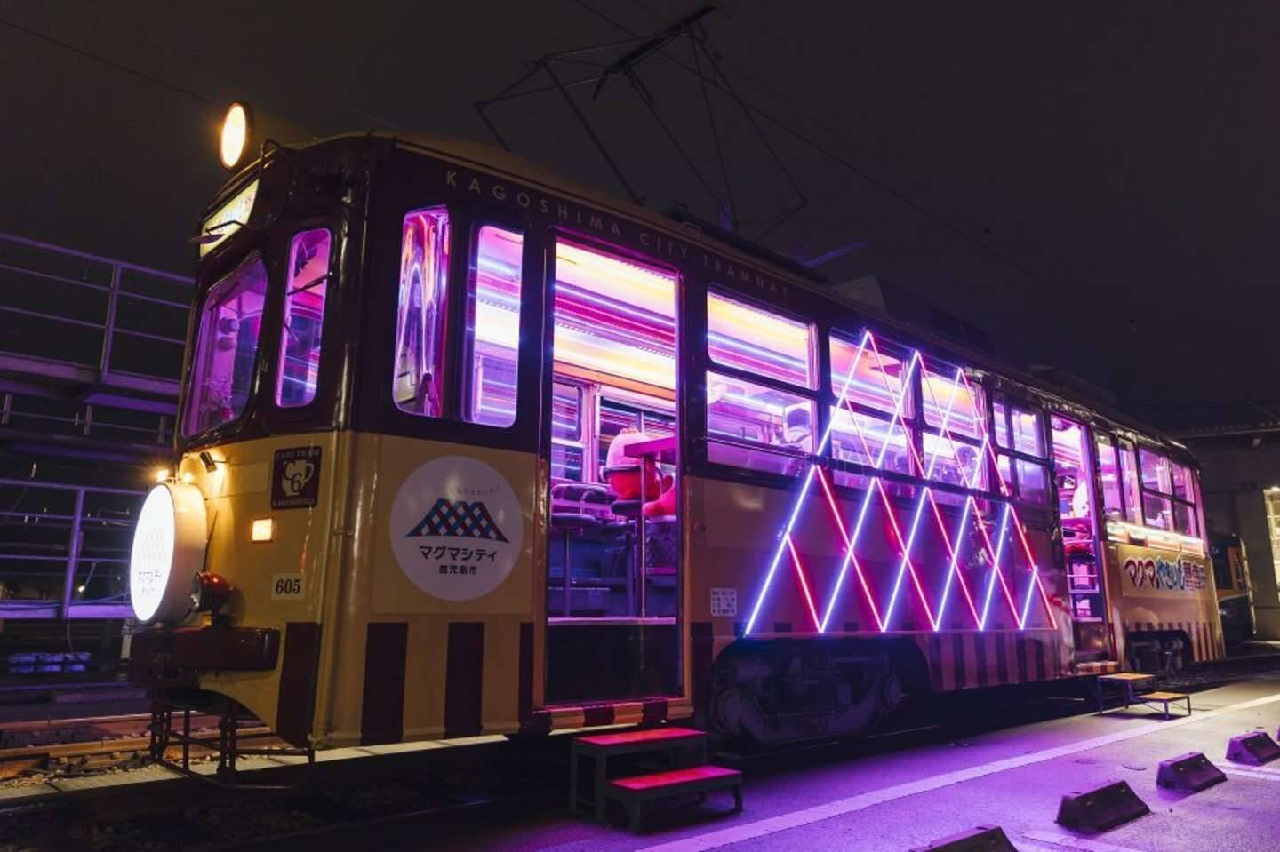 外観は、⿅児島市のブランドメッセージ「あなたとわくわく マグマシティ」のロゴをイメージしたLEDで装飾。車内もマグマシティカラーである赤と青のラインが走る、イルミネーション仕様。乗りたくもあるし、外から見たくもある......そんなスペシャルな路面電車だ。
