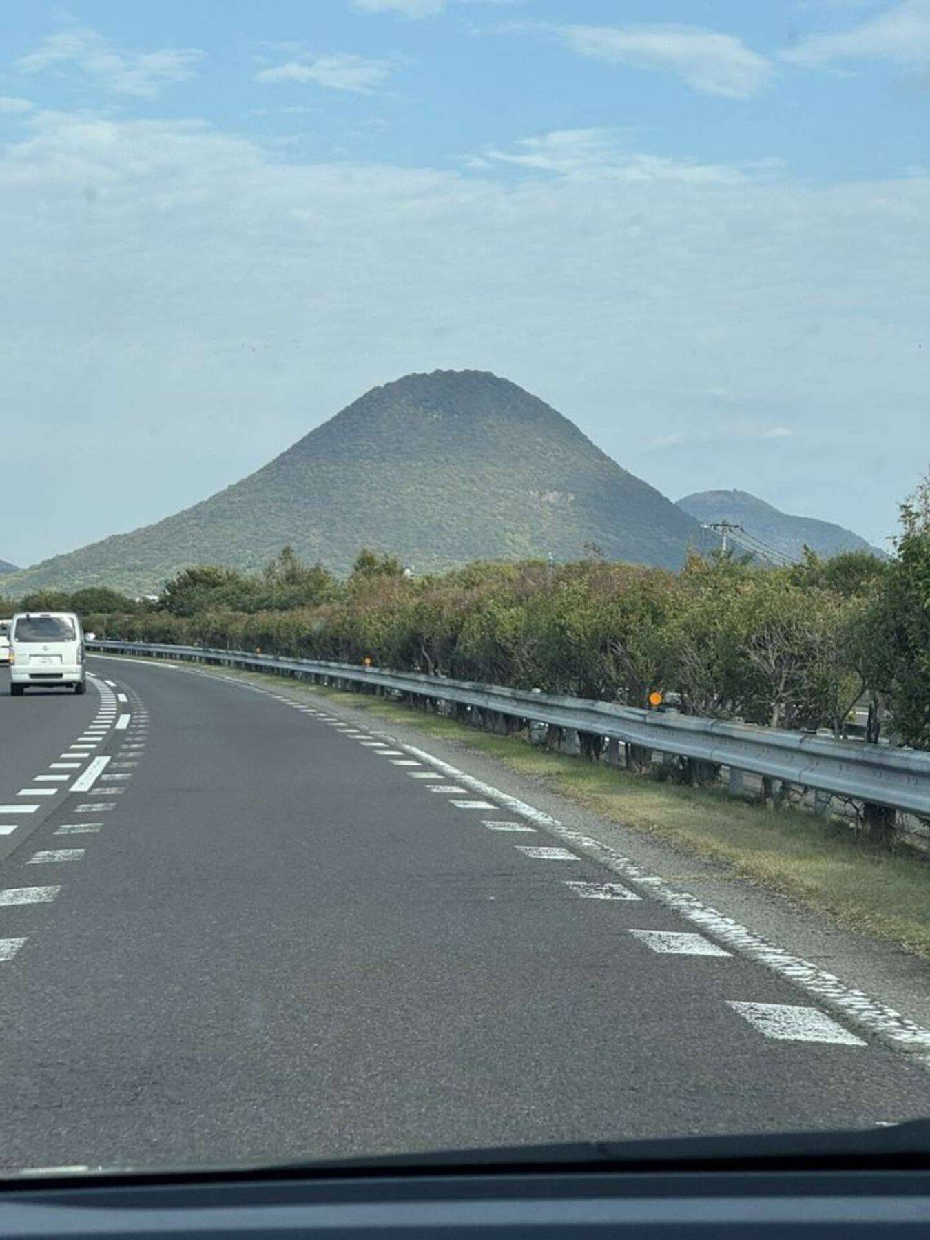 道の向こうに見える山は......確かに、山すぎる。きれいな円錐形のシルエットが青空に映え、まるで教科書に載っている山のイラストのよう。