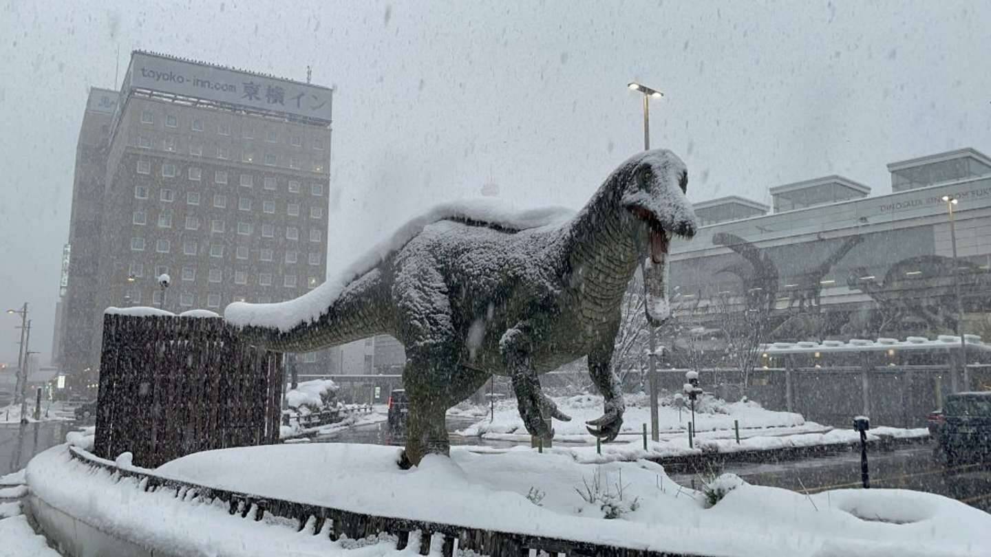 かつて絶滅したはずの恐竜たち。雪の中の福井駅前で、彼らの「リベンジ」が静かに始まっているのかもしれない。(ライター:Met)