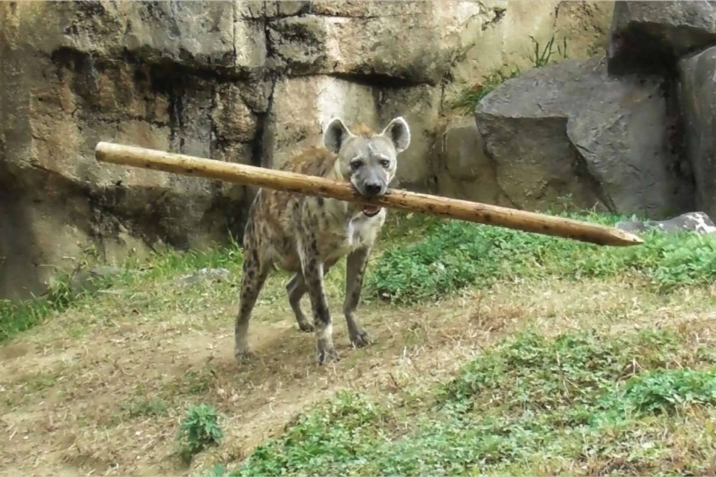 取材に応じた同園の飼育担当者によると、〝いい感じの棒〟をくわえていたのは、ブチハイエナの「レイ」。18歳の男の子だ。