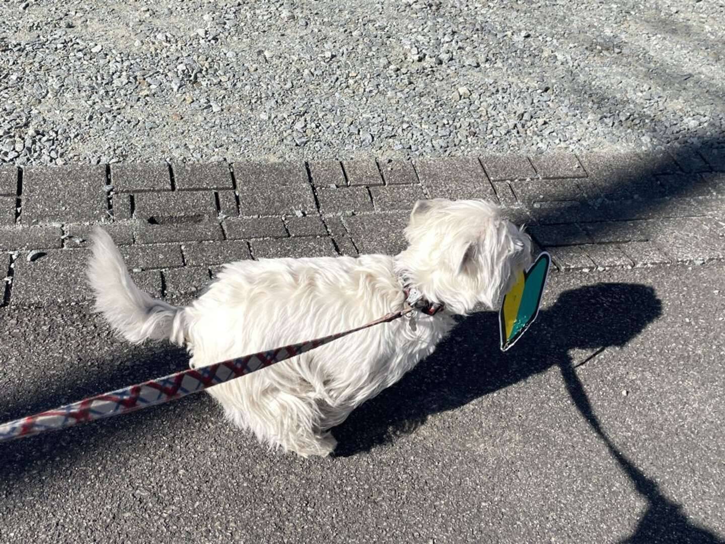 飼い主さんによると、初心者マークを口にくわえているのは、ウェスティ(ウエスト・ハイランド・ホワイト・テリア)の「タオ」。