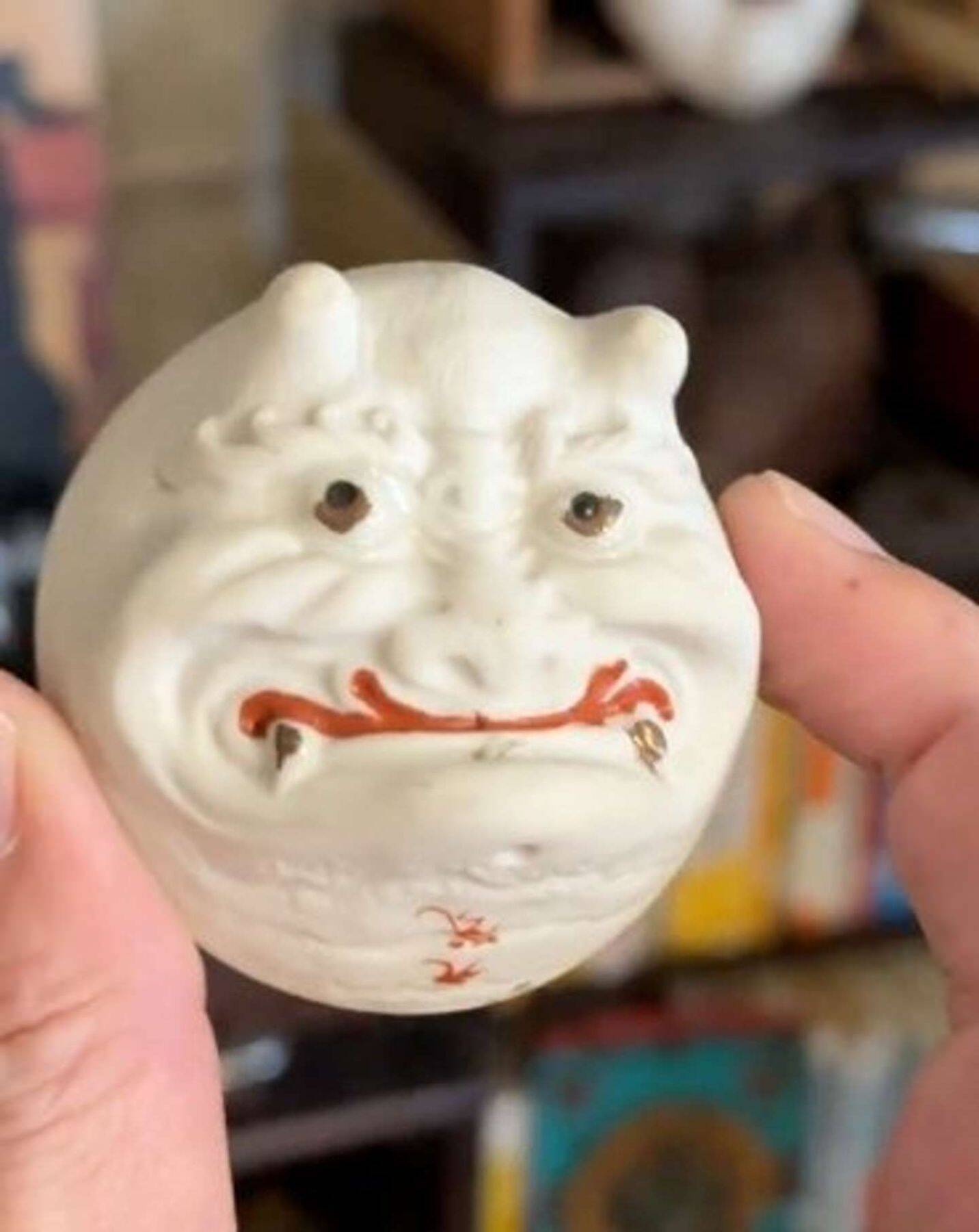 「能登の古民家の蔵から出てきた九谷の盃」だという。盃の外側には鬼、内側には福が描かれている。