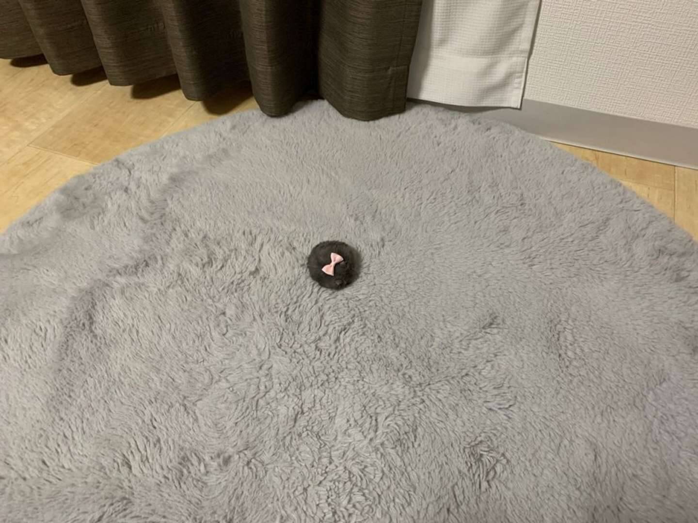 北海道札幌市の整体サロン「エンタ治療院」のXアカウント(@entachiryouin)が2026年2月22日に投稿したのは、グレーのラグの中央にちょこんと落ちている、リボンが付いた丸いもの。