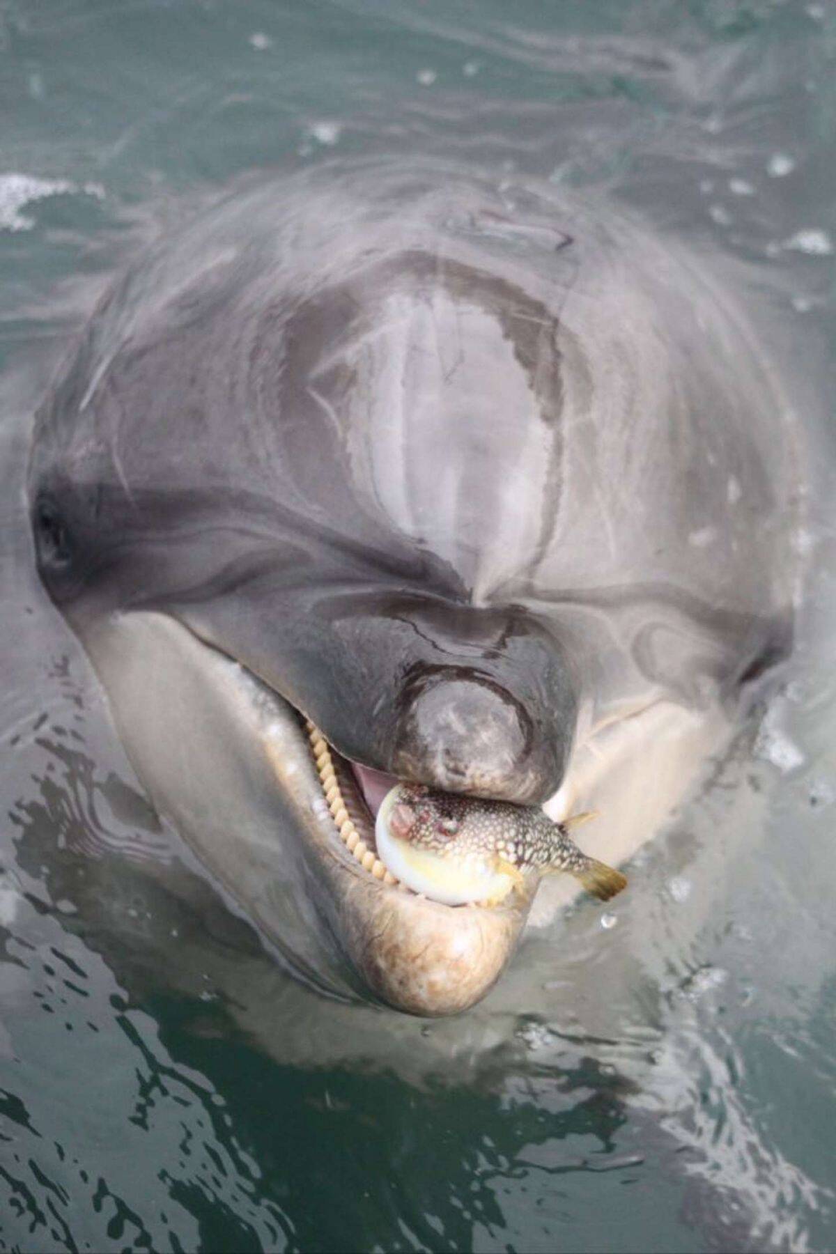 イルカの方はどことなくご満悦そうな表情に見えるが......自分より何倍も大きいヤツにくわえられているフグ側からしたら、かなり焦る事態だろう。