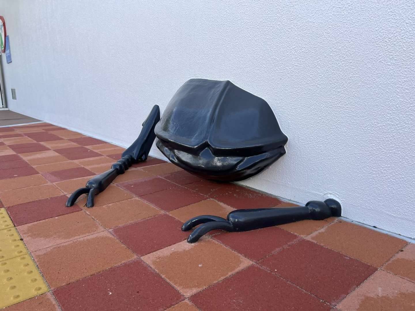 取材に応じた「キッピー山のラボ」コミュニケーターの吉田さんによると、尻は展示品の1つ。同施設がある里山の代表的な昆虫であるミヤマクワガタをモデルに、実物の70倍の大きさで作られた「ジャンボクワガタ」だという。