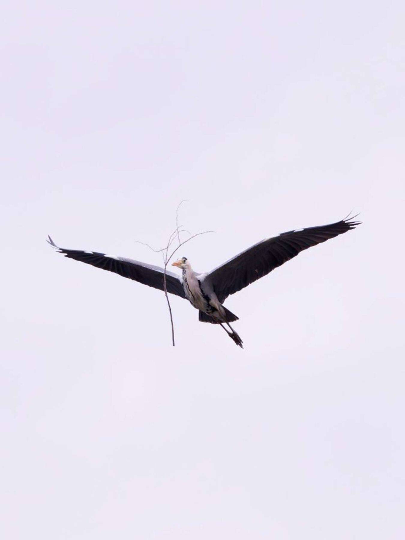 大きく羽を広げて飛ぶ姿は躍動感が......とかいう前に、枝!? なにそれ!? けっこうな大きさの枝が、アオサギの目の前に。まるで浮いているかのように......。どうなってるの!?