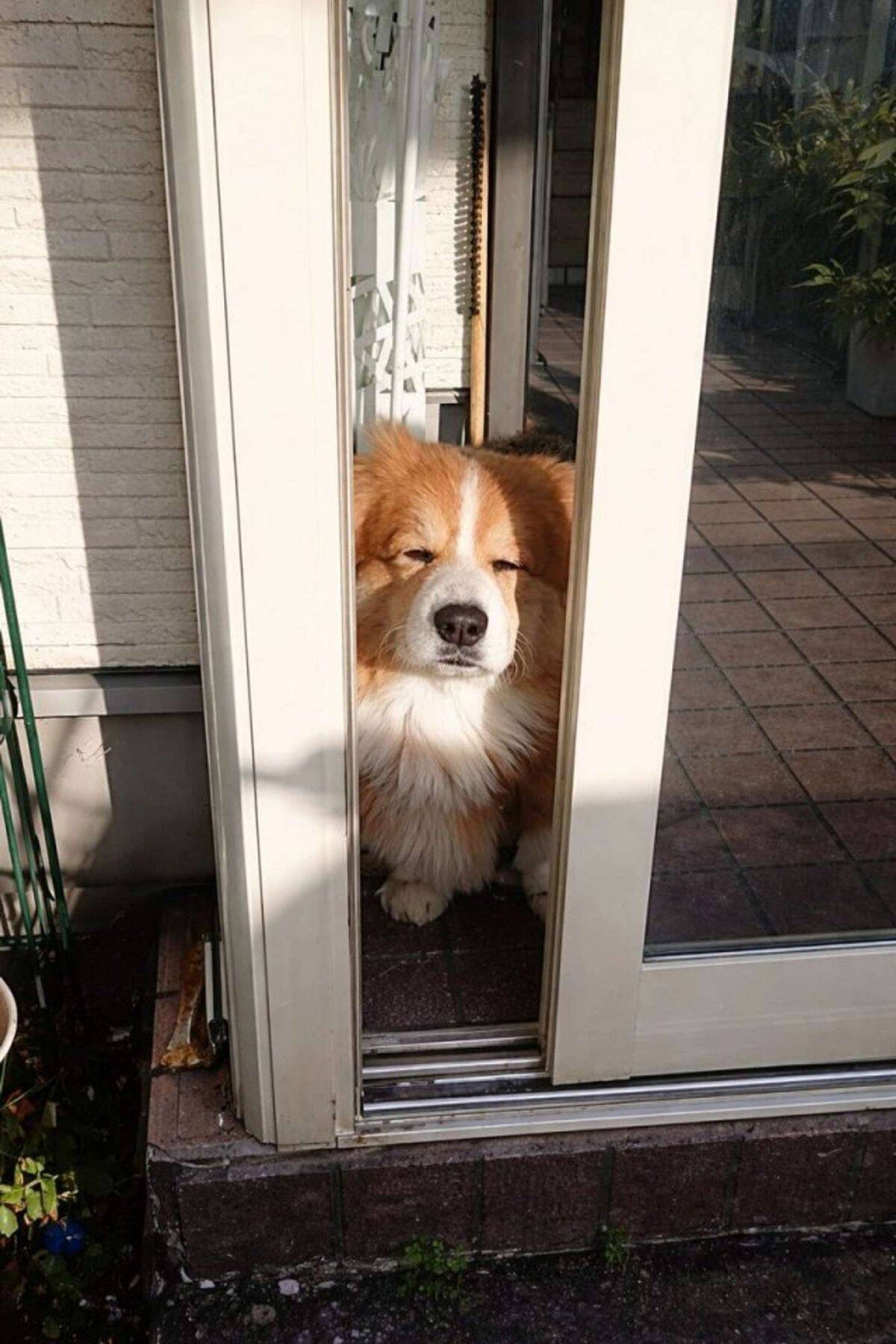 Xユーザーの@104sskさんが2026年4月3日、そんな呟きと共に投稿したのは、サッシ戸の隙間から顔をのぞかせる1匹のワンコ。