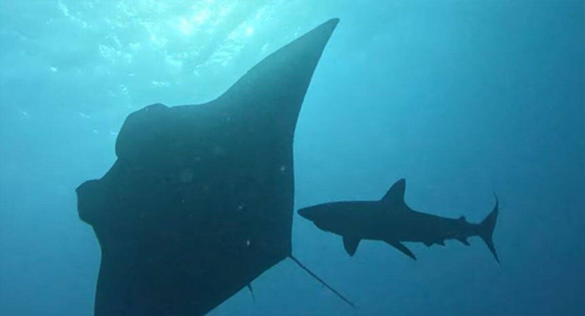 サメがマンタに体をこすりつけ、掃除用具として使っていた