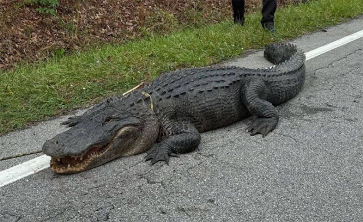 アメリカ・ノースカロライナ州オンスロー郡で、体長約3m、体重約180kgの巨大なアメリカワニが道路の中央付近に姿を現した。
