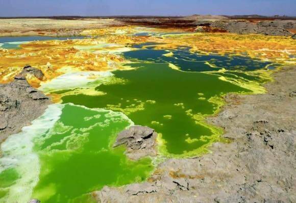 ここは長さ249キロにも渡る不毛の灼熱低地で、ダロル火山があり、さまざまな色をした地熱地帯が広がっている。近くにある湖水の塩分濃度は非常に高く、超高温で強酸性と生物にとっては地獄のような環境だ。
