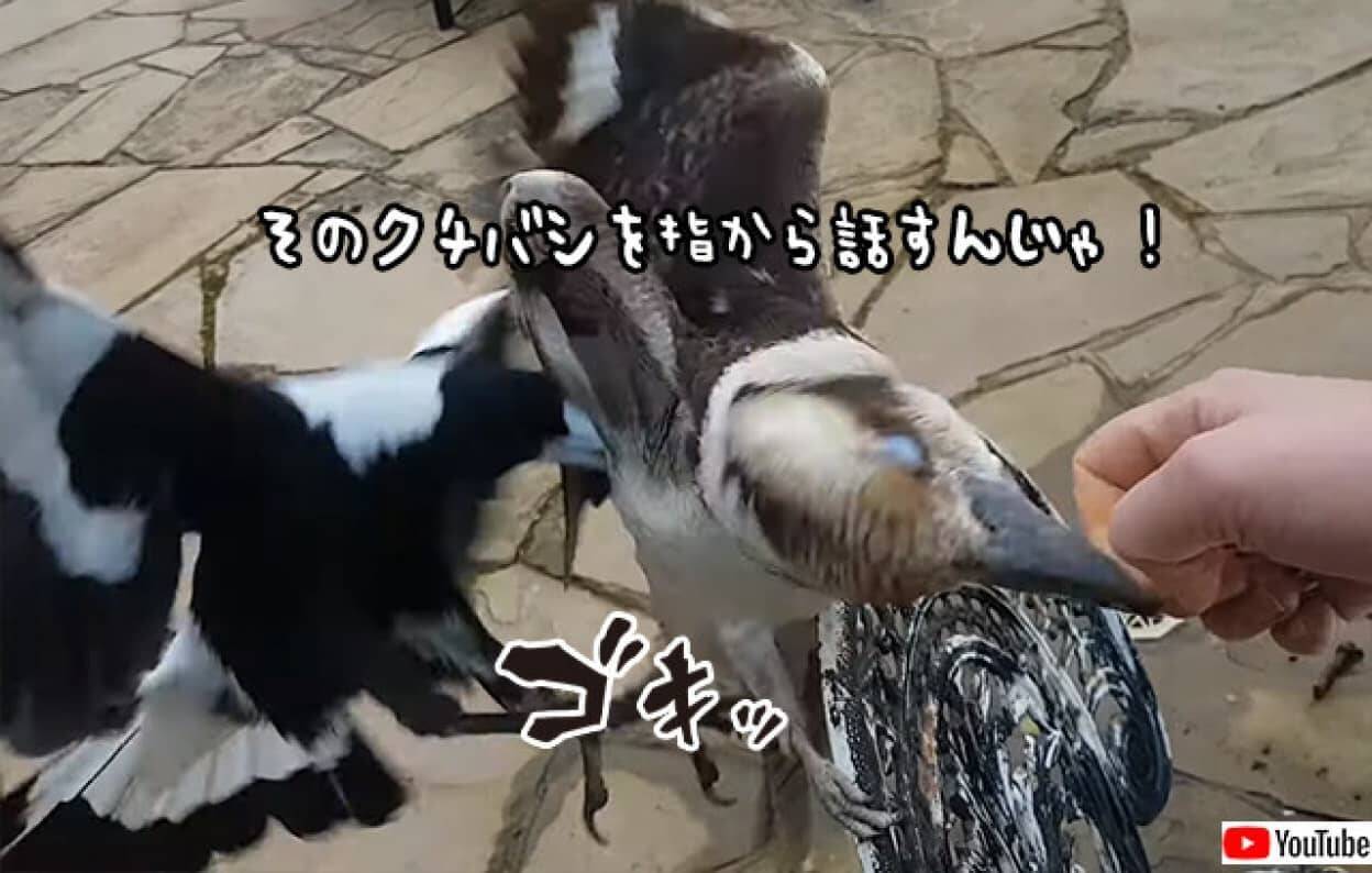 みんなは餌をもらえているのに自分だけはもらえない。これに腹を立てたワライカワセミは、女性の指に噛みついたまま離さなかったようだ。