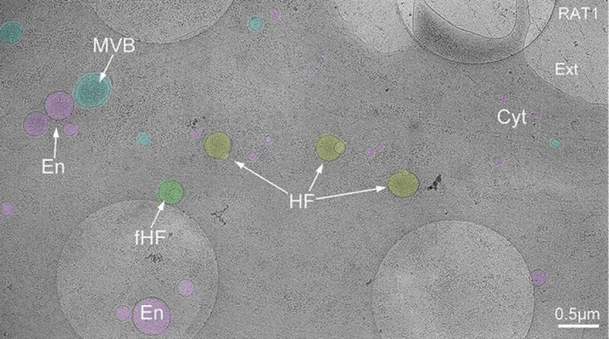 今回、クライオ電子線トモグラフィーを用いて人間・サル・ラット・マウスの細胞を調べたところ、いずれの細胞にも「半融合膜(hemifusion diaphragm)」という構造で仕切られた2つの小胞が対になって存在していた。