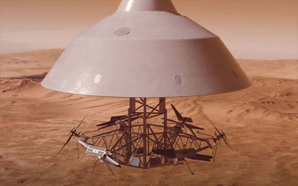 火星の大気圏に突入する1基のカプセル。その中には6機の自律型ヘリが格納されている。