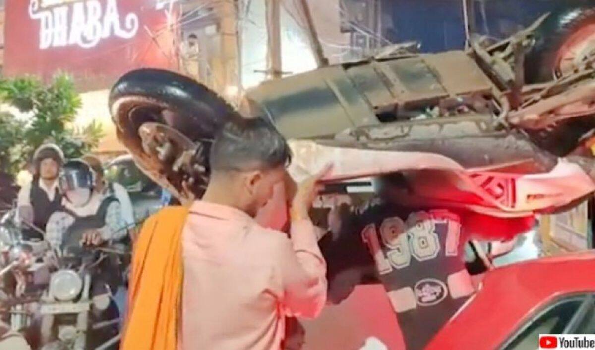 インドのSNSで話題になっているこの動画。2人の男性が、渋滞を避けるためにスクーターを持ち上げて車の隙間を縫って歩いている。