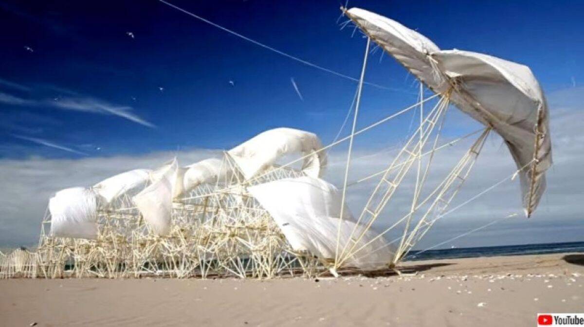 浜辺に吹く風を受け、まるで骨格のような「脚」で砂の上をすべるように進む奇妙な「生き物」たち。