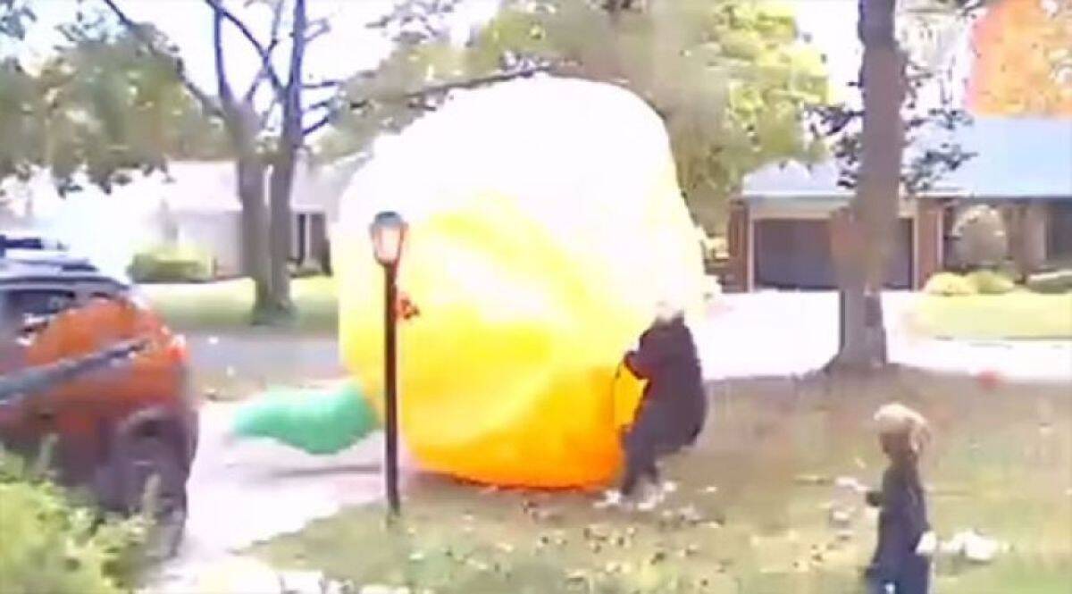 ミシガン州の郊外に住むケイティ・モーガンさんの家で、自宅の庭に設置していた巨大なハロウィン用の風船カボチャが、突風を受けて大きく揺れ始めた。