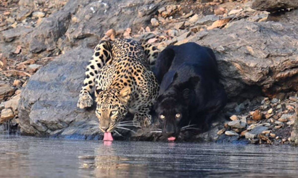 インド南西部、カルナータカ州にあるバドラ・トラ保護区で、ヒョウとクロヒョウが並んで水を飲む姿が撮影された。