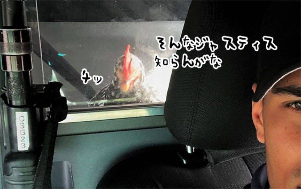 納得がいかない様子のニワトリは「不当逮捕だ!」とばかりに、パトカーの後部座席から警察官を鋭い眼光で睨みつけ、終始不機嫌な面構えを見せていた。