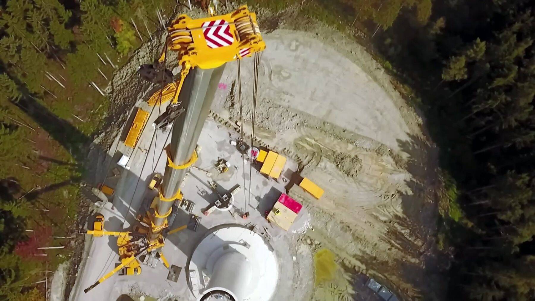 2025年6月公開のこちらの動画では、ドイツでLTM11200‑9.1が、世界最大級の風車の支柱(風車の中心までの高さ178m)を組み上げる様子がとらえられている。