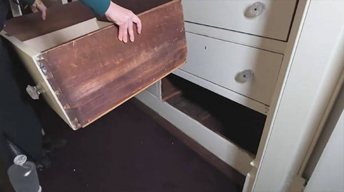 最近になって、壁際に作り付けられた重い引き出しの、一番下の段を取り外したところ、床板に長方形の穴が切り込まれているのが確認された。