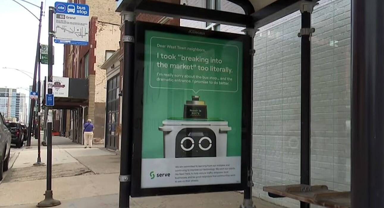 References: Cbsnews[https://www.cbsnews.com/chicago/news/second-delivery-robot-crashes-into-bus-shelter-this-time-in-old-town/] / Blockclubchicago[https://blockclubchicago.org/2026/04/14/food-delivery-robot-says-sorry-for-smashing-bus-shelter-in-new-ad/]