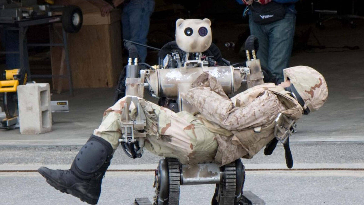 アメリカのVecna Robotics社が開発した「BEAR」は、クマのような顔で、227kgを運べる油圧アームを備え、負傷兵を安全な場所へ搬送する。