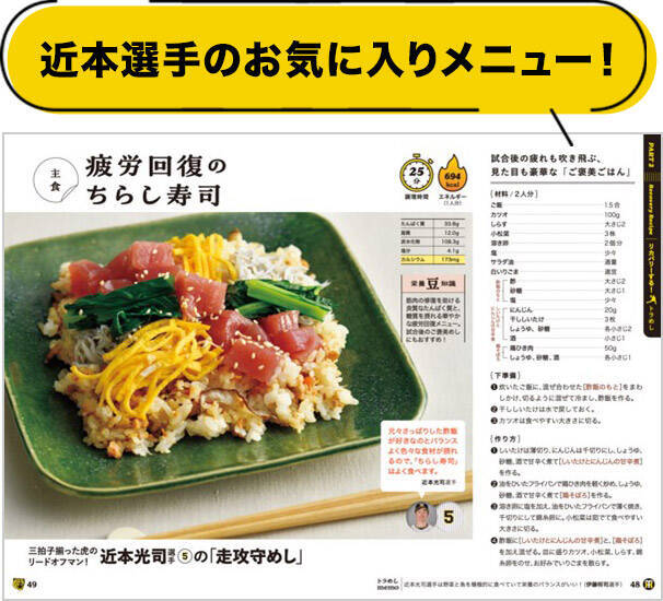 その吉谷さんが監修した本書では、実際に選手たちに指導してきた栄養知識や、選手寮や遠征先のホテルで提供される“トラめし”のレシピを初公開しています。「体をつくる」「疲労回復」「体をしぼる」の3つのテーマで紹介しているメニューは、どれも選手たちに人気が高く、家庭でも簡単につくれるものばかりです。また、本書では主力選手の食事に関するインタビュー、体づくりやコンディショニングにまつわる食のエピソードも掲載。さらに、寮やクラブハウスの人気メニューランキングや選手の裏話なども紹介しています。
