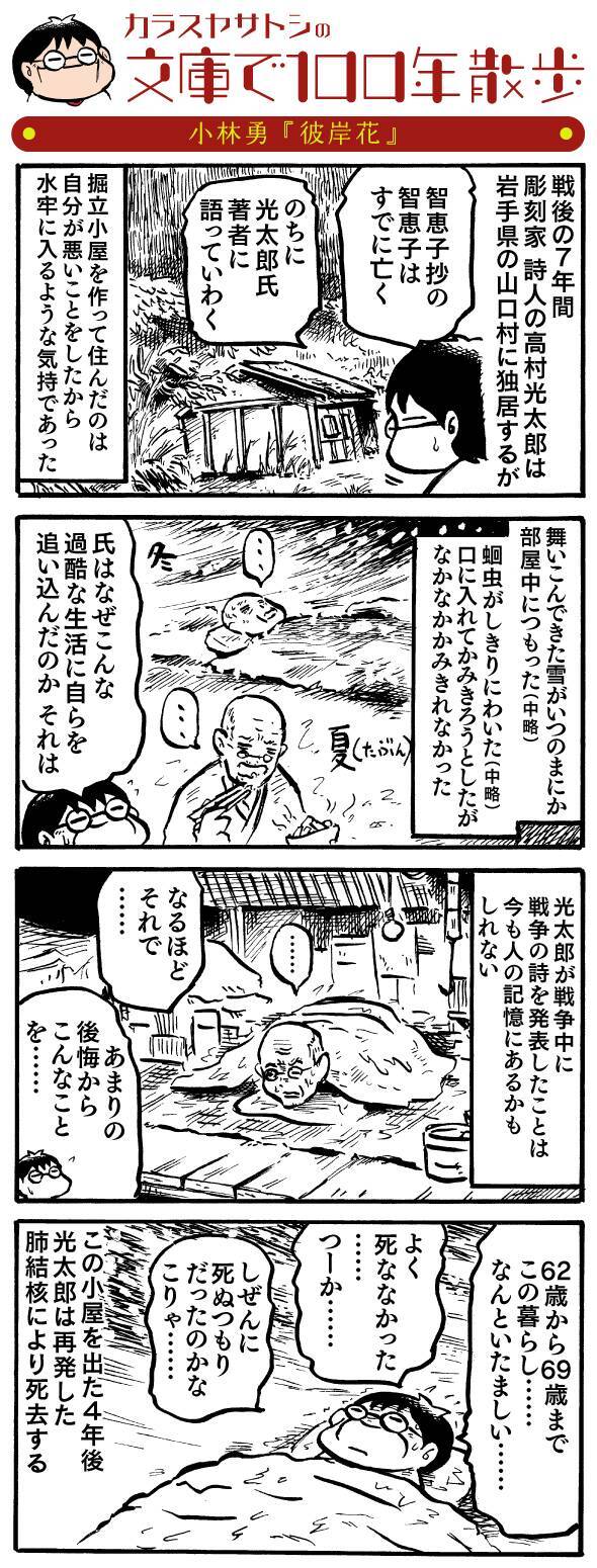 1973年生まれ。漫画家。著作に『カラスヤサトシ』『カラスヤサトシのおしゃれ歌留多』『強風記』『喪男の社会学入門』『毎日カラスヤサトシ』『オレは子を見て育とうと思う』『カラスヤサトシの世界スパイス紀行』『おとろし』『カラスヤサトシの孫子まるわかり』『カラスヤサトシの戦国散歩』など多数。近刊にこの連載「文庫で100年散歩」を収録した『カラスヤサトシの日本文学紀行』(9月27日発売)があります。