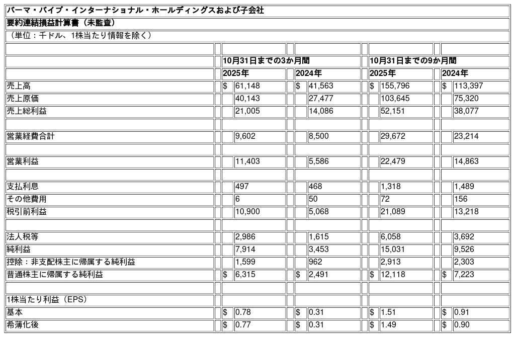 テキサス州ザ・ウッドランズ--(BUSINESS WIRE)-- (ビジネスワイヤ) -- パーマ・パイプ・インターナショナル・ホールディングス(NASDAQ:PPIH)は、2025年10月31日を期末とする第3四半期決算を公表しました。