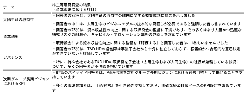 当社は2008年にT&D HDの株主となり、現在、T&D HDの経営陣および取締役会との継続的かつ建設的な対話を実施しております。このような対話の機会を得られていることに、深く感謝しております。当社は、T&D HDに対し、企業価値向上に向けた大胆な改革を遂行するとともに、経済価値ベースの指標をKPIに据えた『EV経営』を推進し、キャピタル・アロケーション戦略においても同様の観点を徹底することを求めています。