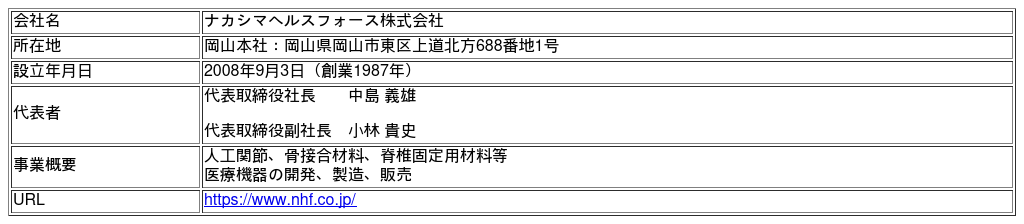 ナカシマホールディングス傘下のNHF社は、整形外科領域で長い歴史と実績を持ち、国内医療機関や研究機関と連携した研究開発を行い、強固な国内販売網を持っています。