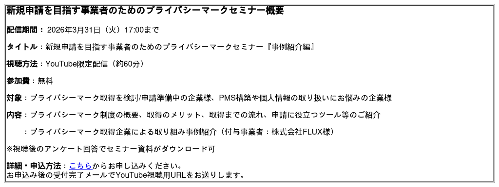 プライバシーマーク制度を運営する一般財団法人日本情報経済社会推進協会(以下 JIPDEC)では、このたび、プライバシーマークの新規取得を検討されている企業担当者様向けに、スタートアップ企業におけるプライバシーマーク取得までの取り組み事例や、「個人情報」の安全な管理方法と社内体制の構築ポイントを解説するオンデマンドセミナーを期間限定で公開します。