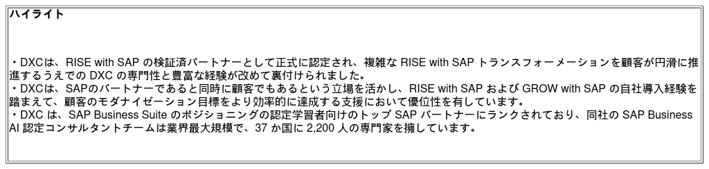 有資格のDXC SAP Business AIコンサルタントチームは、競合他社と比較して世界で最も高い成長率で拡大しており、またSAP Business Suite のポジショニングの認定学習者数においてDXCは第1位にランクされています。これは、SAP導入のあらゆる段階において顧客を支援するDXCの能力とコミットメントを示すものです。DXCは、60年以上にわたり顧客向けのミッションクリティカルなITシステムを提供するためのイノベーションを重ねてきた実績を有しており、2025年には学習およびスキル成長分野における SAP Pinnacle Award を受賞しました。DXCのSAPに関するケイパビリティの詳細については、DXCのウェブサイトwww.dxc.com/sapをご覧ください。