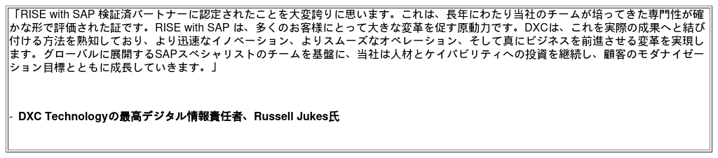 企業が高まる技術的な複雑性やクラウド移行の期限が迫る中で対応を求められるなか、DXCは深いSAPの専門知識と独自のツールを基盤に、モダナイゼーションをエンドツーエンドで実現するシームレスなアプローチを提供しています。DXCは、複数のプラットフォームに対応可能なマネージド・サービス・プロバイダー(MSP)ソリューションであるDXC Completeをはじめとする独自の提供サービスを通じて、シームレスな移行、業務プロセスの最適化、アプリケーション管理、そしてSAPワークロードの継続的な改善を実現します。RISE with SAP 検証済パートナーとして、DXCの実証された能力はSAPの方法論と完全に整合しており、顧客に対して、より高い一貫性、迅速性、そして付加価値の提供を可能にしています。