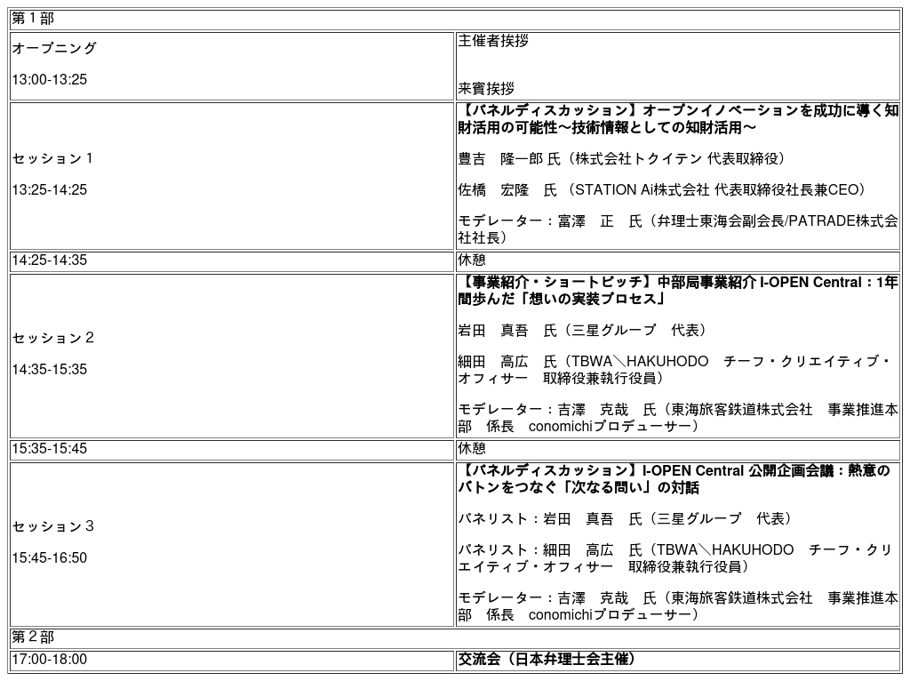 令和7年度第9回目となる「つながる特許庁 in 名古屋」では、セッション①【パネルディスカッション】オープンイノベーションを成功に導く知財活用の可能性~技術情報としての知財活用~ セッション②【事業紹介・ショートピッチ】中部局事業紹介 I-OPEN Central:1年間歩んだ「想いの実装プロセス」 セッション③【パネルディスカッション】I-OPEN Central 公開企画会議:熱意のバトンをつなぐ「次なる問い」の対話 をテーマに、企業の取組について情報発信します。