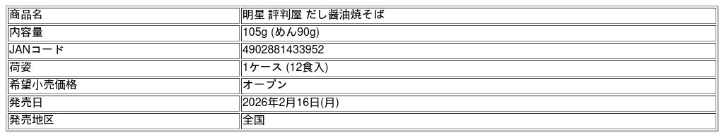 明星食品株式会社 (社長:豊留昭浩) は、カップ焼そば「明星 評判屋 だし醤油焼そば」を、2026年2月16日(月)に全国で新発売します。