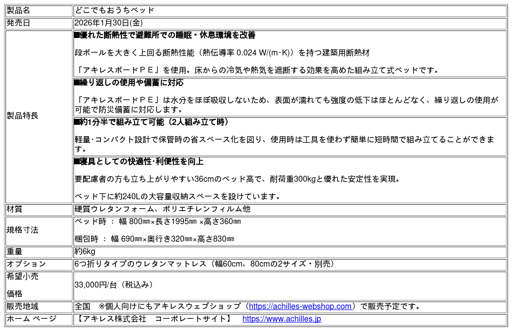 アキレス株式会社(本社:東京都新宿区、社長:日景一郎)は、優れた断熱性能を持つ建築用断熱材を使用し、災害時の避難所における睡眠・休息環境を改善する『どこでもおうちベッド』を、 2026 年 1 月 30 日 ( 金 ) より発売します。