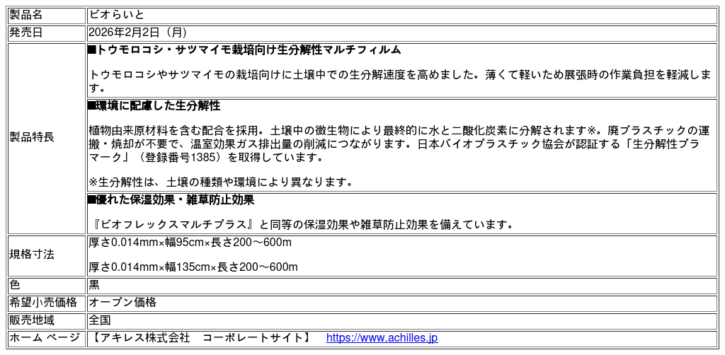 アキレス株式会社(本社:東京都新宿区、社長:日景一郎)は、生分解性マルチフィルムの新製品として、トウモロコシやサツマイモの栽培向けに土壌中での生分解速度を高めた『ビオらいと』を 2 月 2 日 ( 月 ) より発売します。