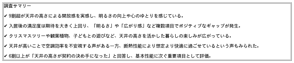 さらに自由回答からは、契約時には想像していなかった、高天井による「伸びやかな日常」や「趣味の広がり」を喜ぶ声が多数寄せられました。